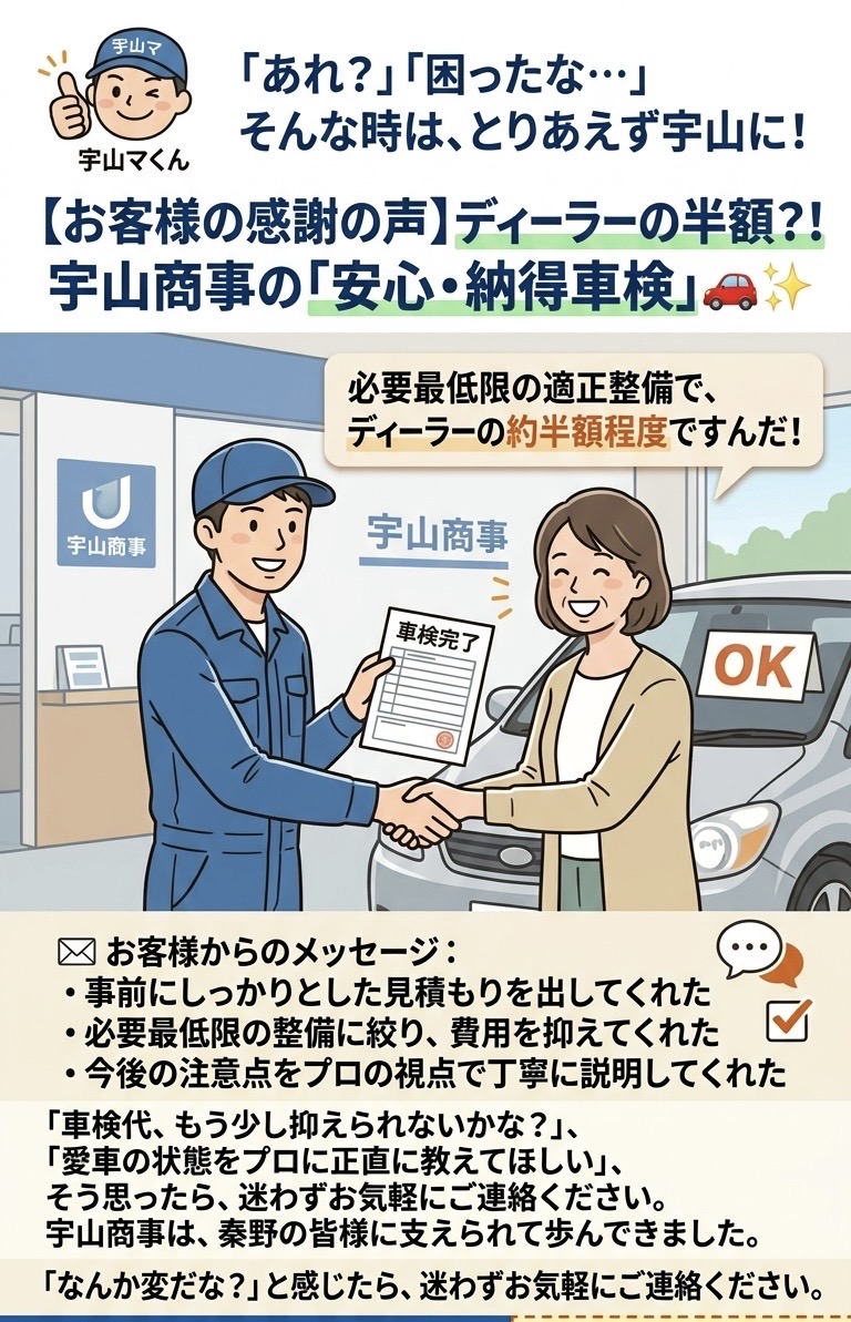 【お客様の感謝の声】ディーラーの半額?!宇山商事の「安心・納得車検」🚗✨